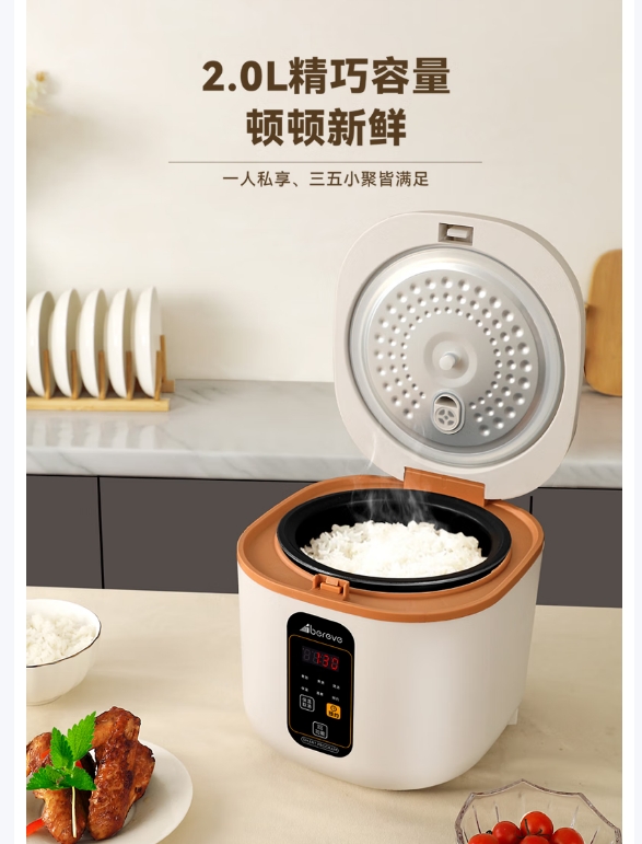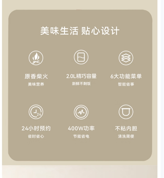 原香柴火 美味营养 ,24小时预约 省时省心, 2.0L精巧容量 新鲜不剩饭 ,400W功率 节能省电, 6大功能菜单 智能省事, 不粘内胆 清洗简便,售后无忧一年内产品质量问题只换不修