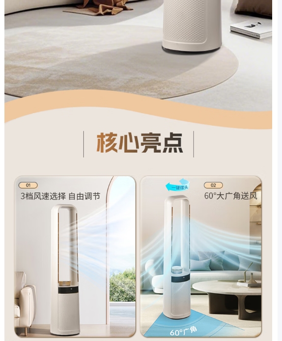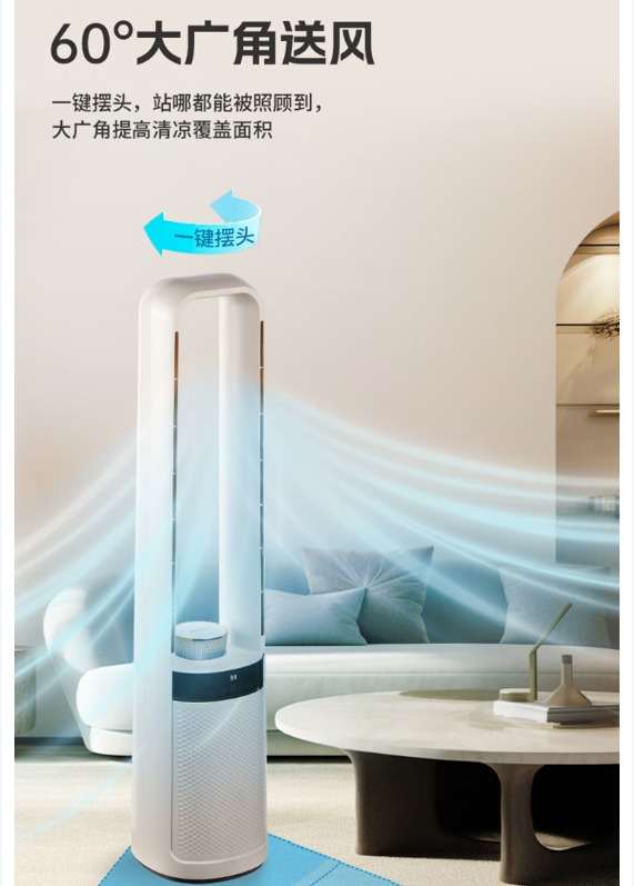 3档风速选择 自由调节,60°大广角送风,6米超远距离送风,12小时预约定时,吹出惬意自然风,售后无忧一年内产品质量问题只换不修