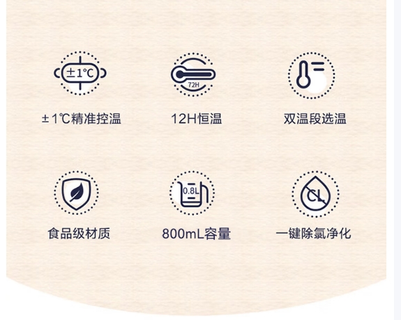 ±1℃精准控温 ,食品级材质, 12H恒温 ,800mL容量, 双温段选温 ,一键除氯净化,售后无忧一年内产品质量问题只换不修