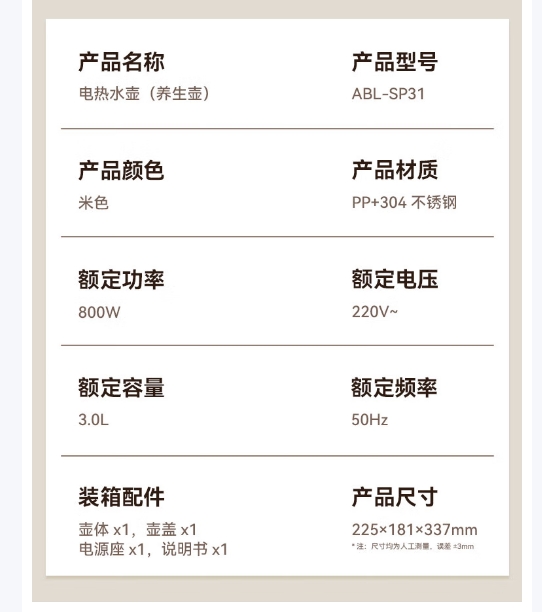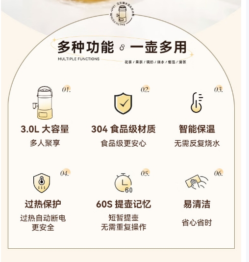 3.0L 大容量,304 食品级材质,智能保温,过热保护,60S 提壶记忆,易清洁,售后无忧一年内产品质量问题只换不修