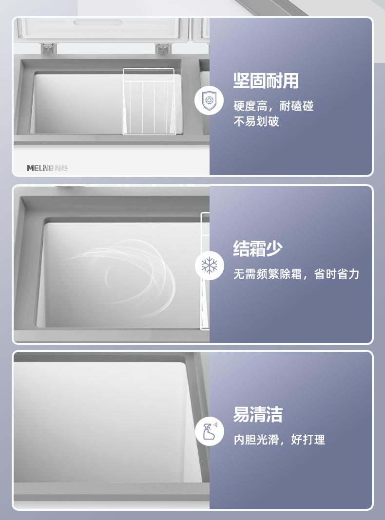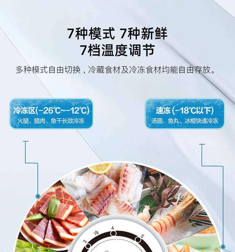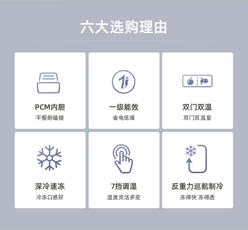 PCM内胆平整耐磕碰 深冷速冻 冷冻口感好, 一级能效 省电低噪, 7挡调温温度灵活多变 ,双温双门双温室, 反重力巡航制冷