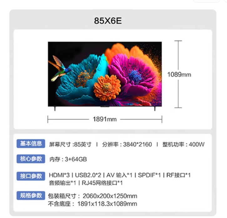 • 含底座尺寸(宽*高*厚)mm不含底座:1891x1089x118.3mm