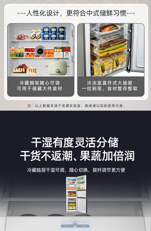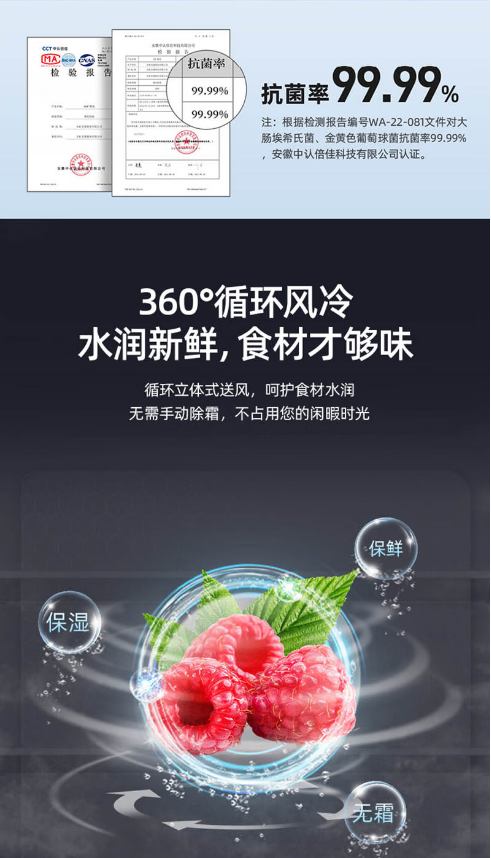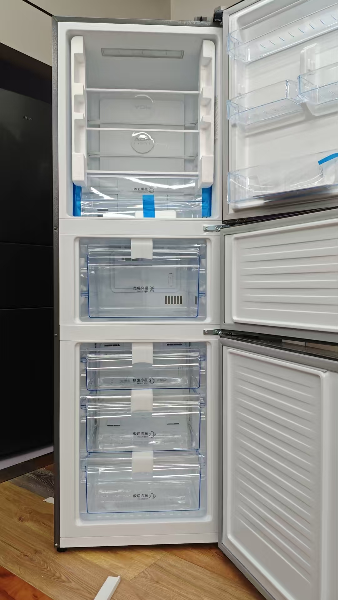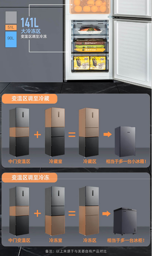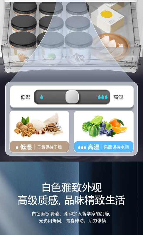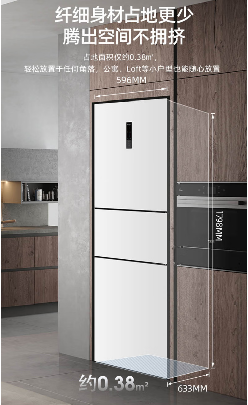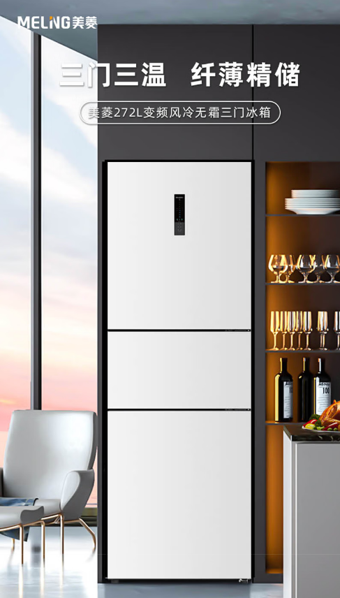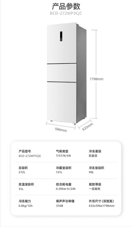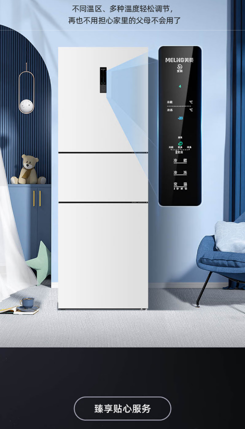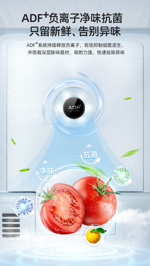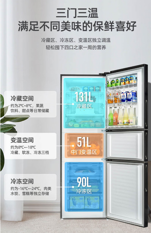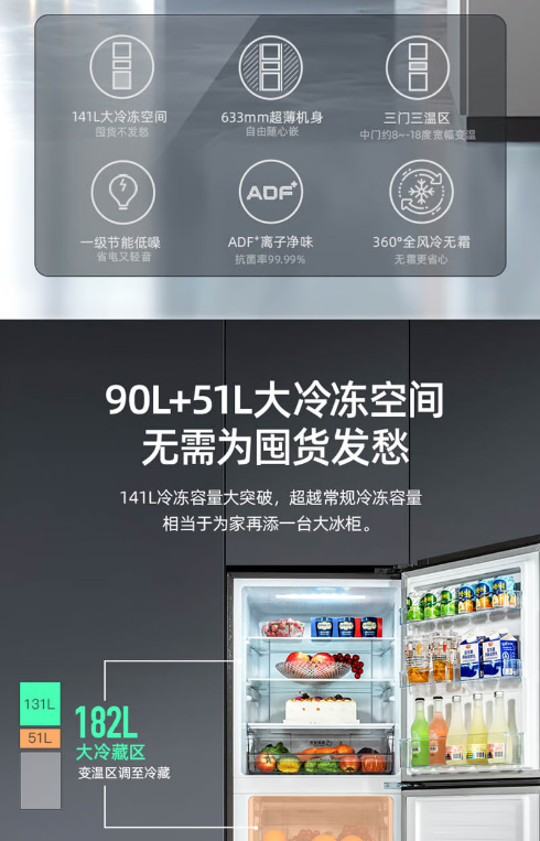 141L大冷冻空间囤货不发愁, 633mm超薄机身自由随心嵌 ,三门三温区, 中门约8~-18度宽幅变温,一级节能低噪,ADF离子净味 抗菌率99.99%,360°全风冷无霜(备注:连接为白色,颜色以连接最下方实物颜色为准)