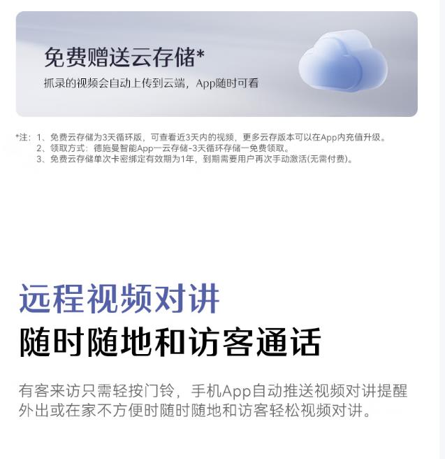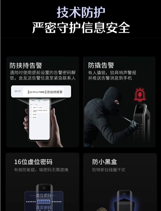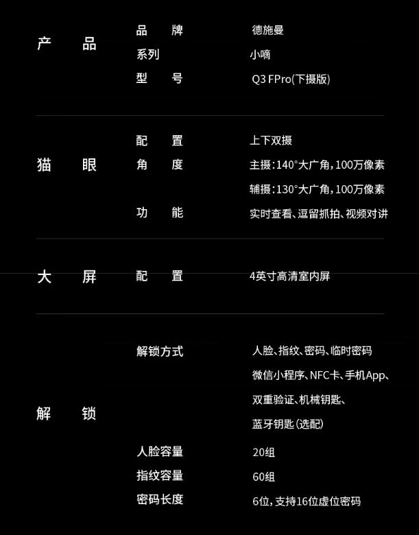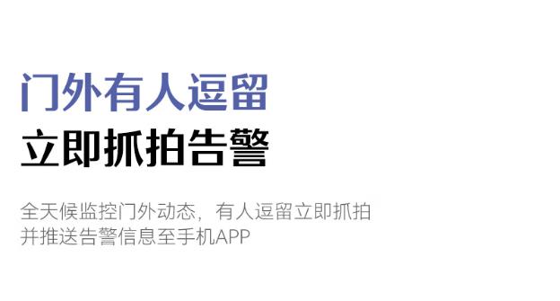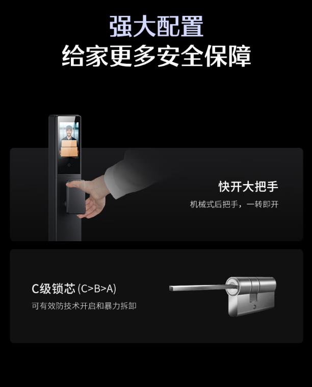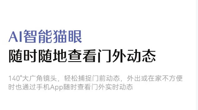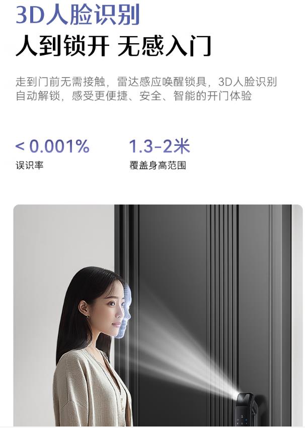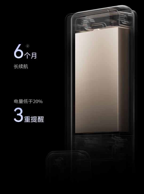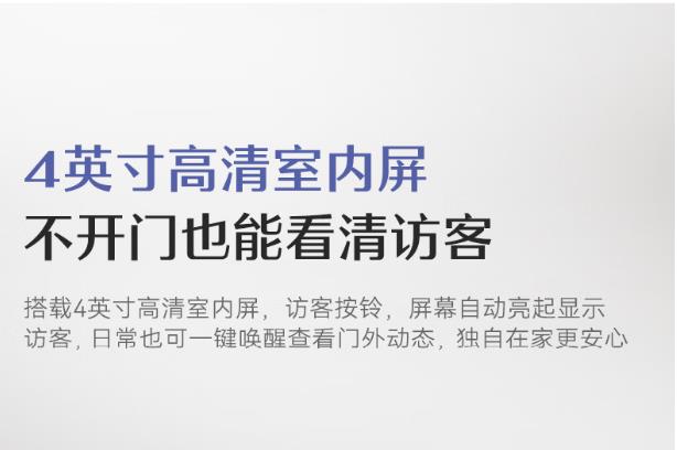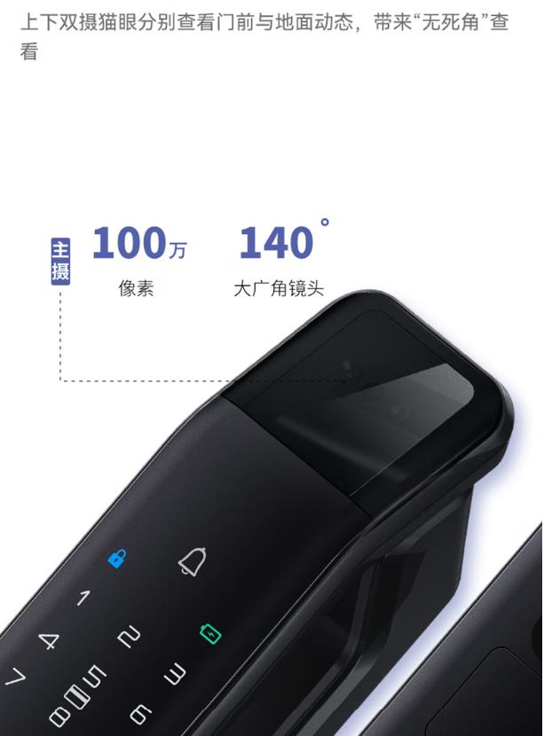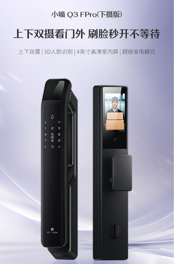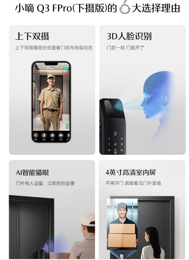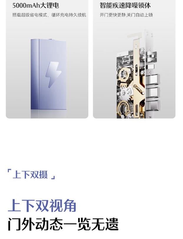 上下双摄猫眼,分别查看门前与地面动态,3D人脸识别,AI智能猫眼, 门外有人逗留,立即抓拍告警,4英寸高清室内屏,5000mAh大锂电, 搭载超级省电模式,循环充电持久续航,智能疾速降噪锁体