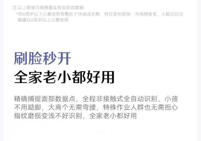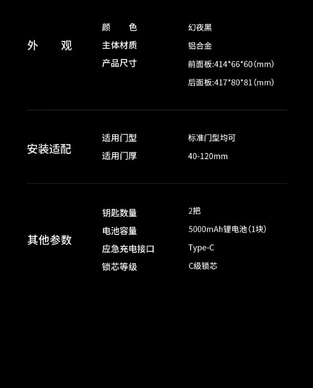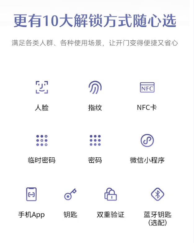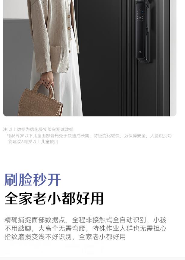 - 开锁方式人脸、指纹、密码、临时密码、IC卡(标配2个) 微信小程序、手机App、双重验证、机械钥匙