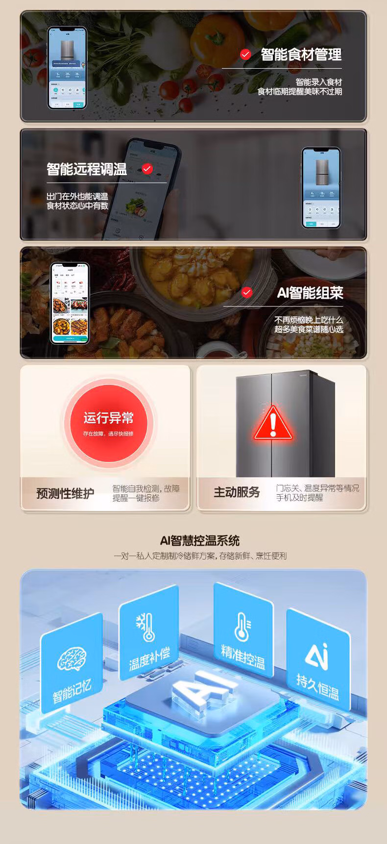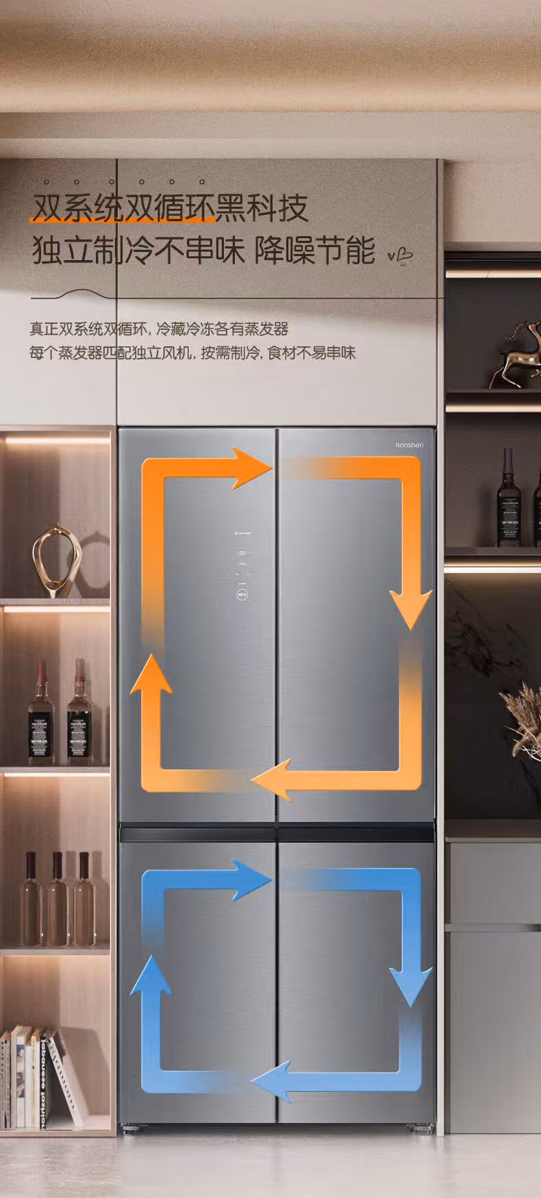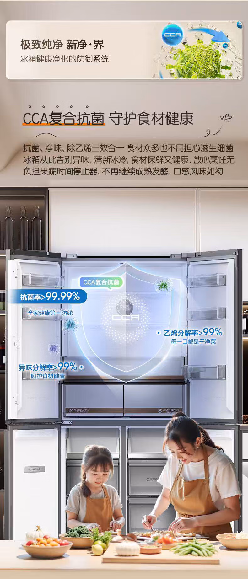 真正双系统双循环黑科技,独立制冷不串味, 降噪节能,CCA复合抗菌净味 抗菌、净味、除乙烯三合一守护食材健康,-31℃ 冰封锁鲜,平嵌 598mm超薄整机,青泽影轻奢面板
