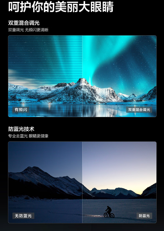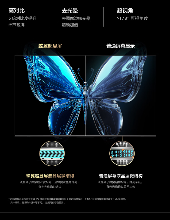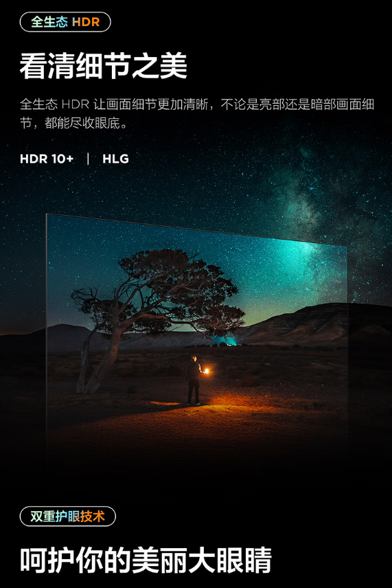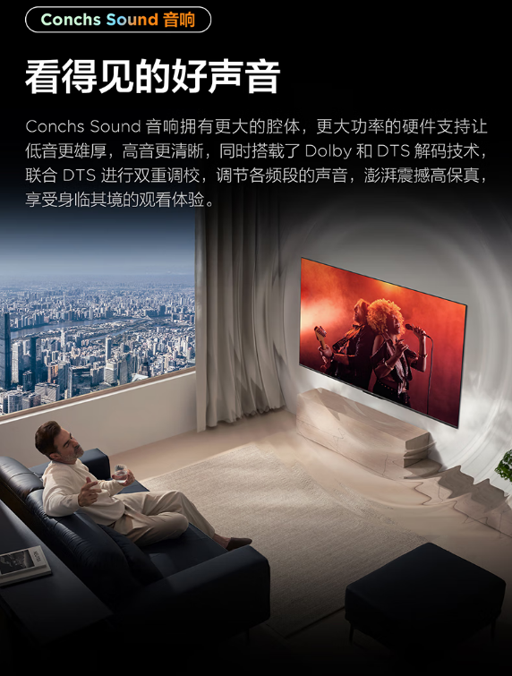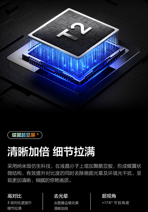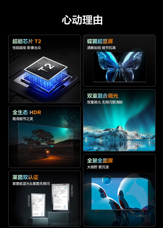 超能芯片 T2,蝶翼超显屏,全生态 HDR,双重混合调光,莱茵双认证,全景全面屏,Conchs Sound 音响,一级能效