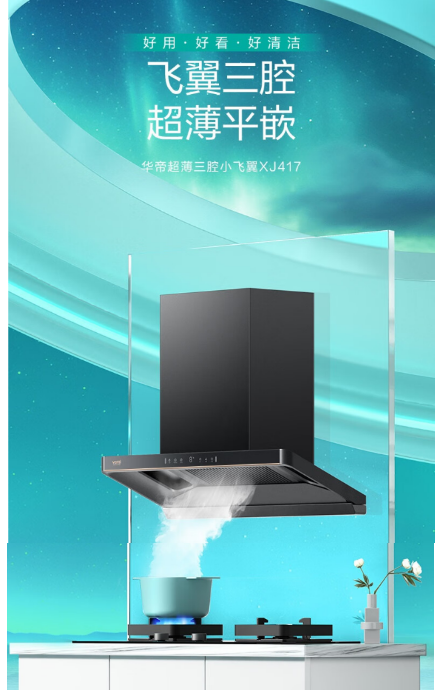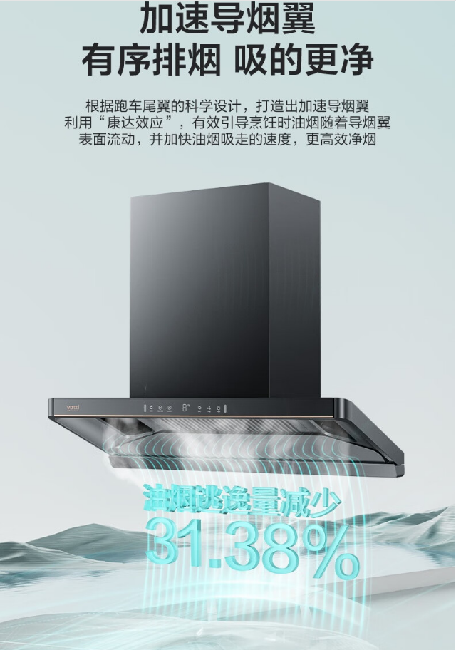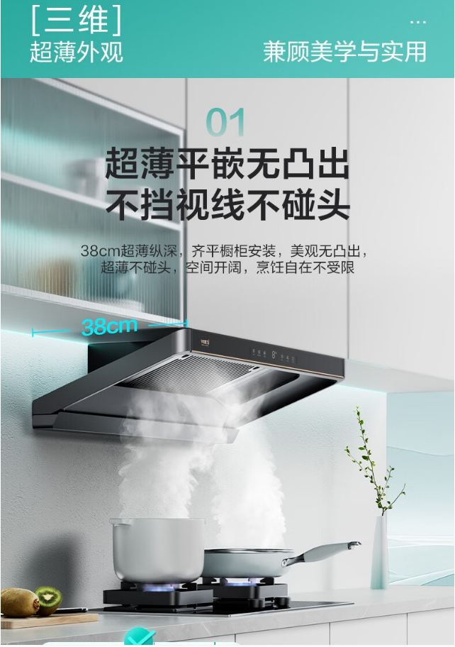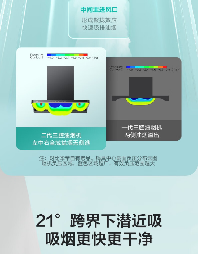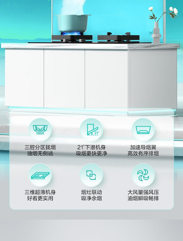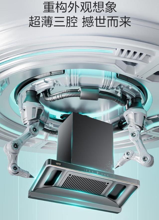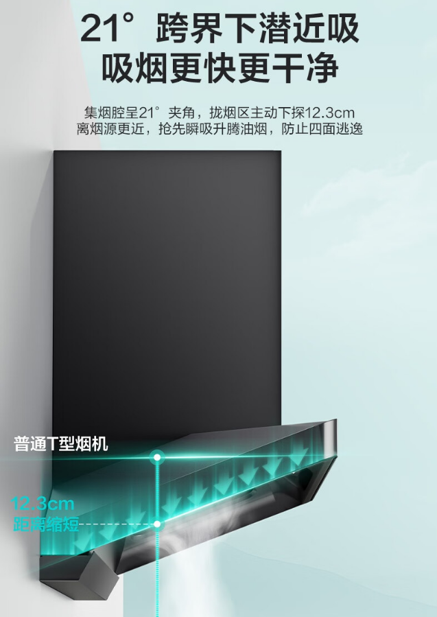 三腔分区拢烟 油烟无侧逃 ,三维超薄机身好看更实用, 21度下潜机身吸烟更快更净 ,加速导烟翼高效有序排烟 ,大风量强风压油烟瞬吸畅排
