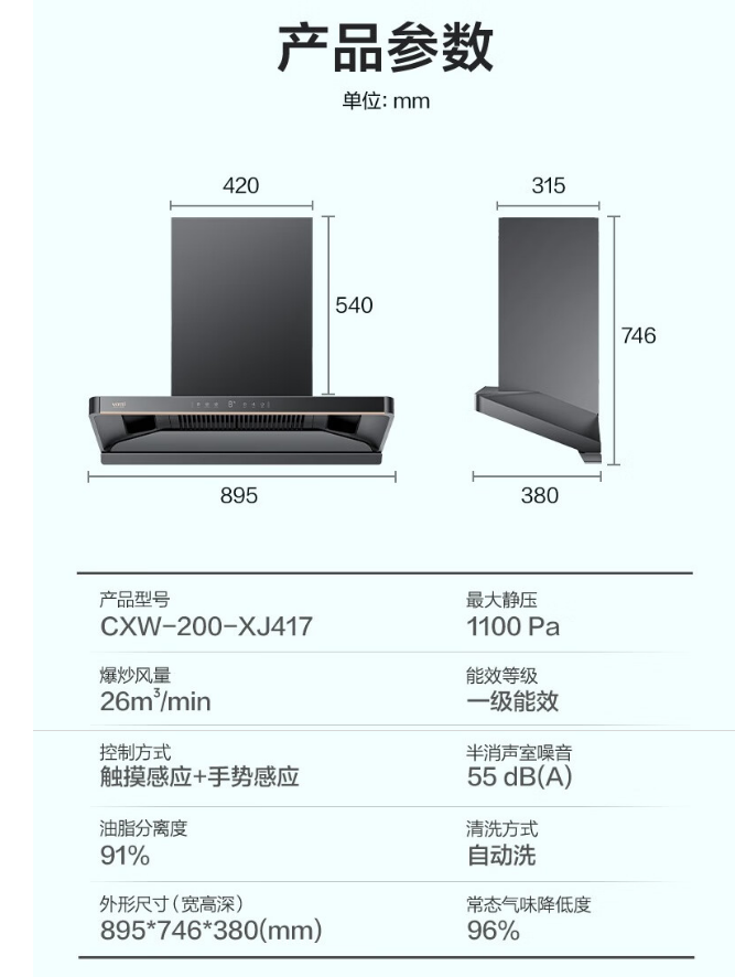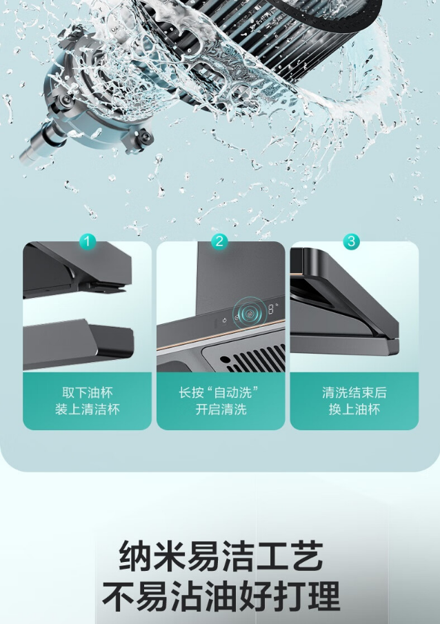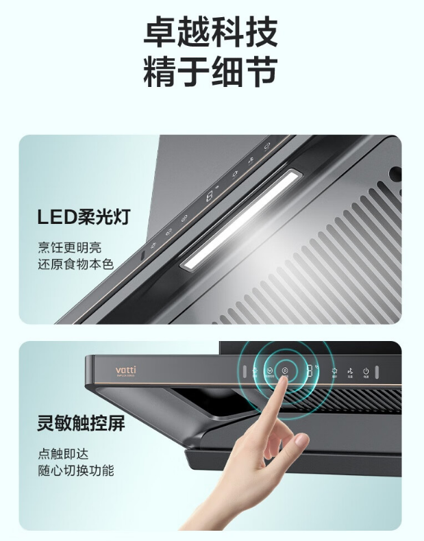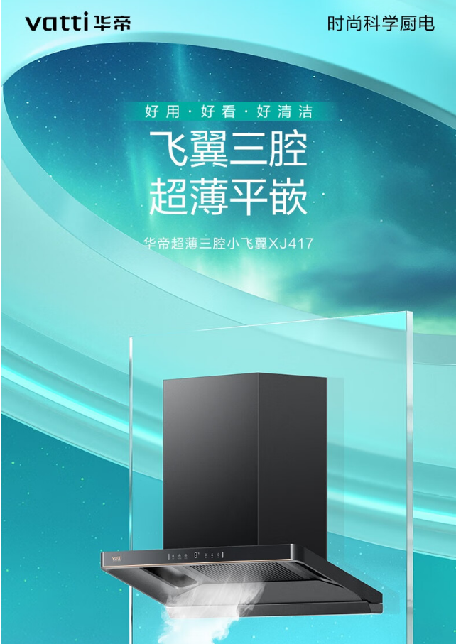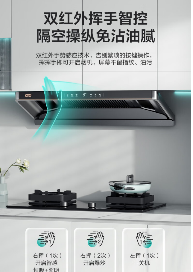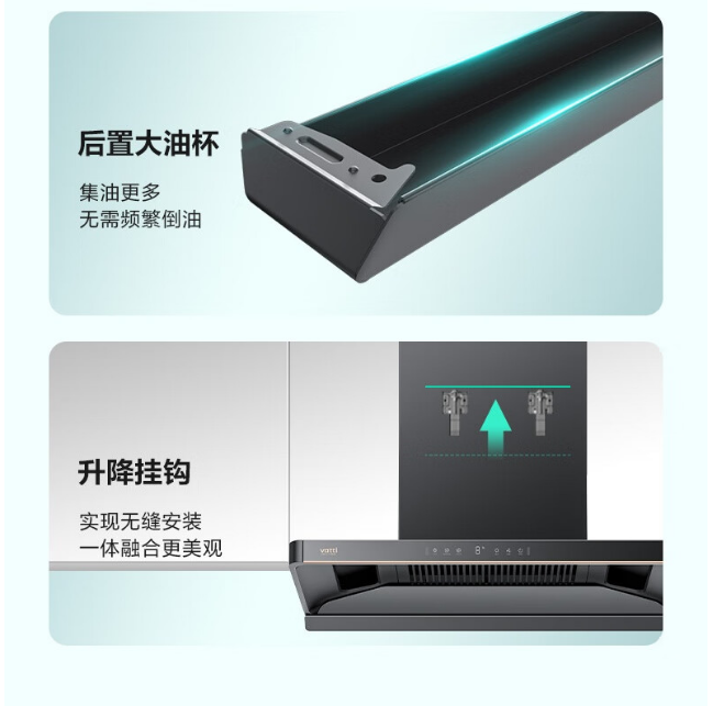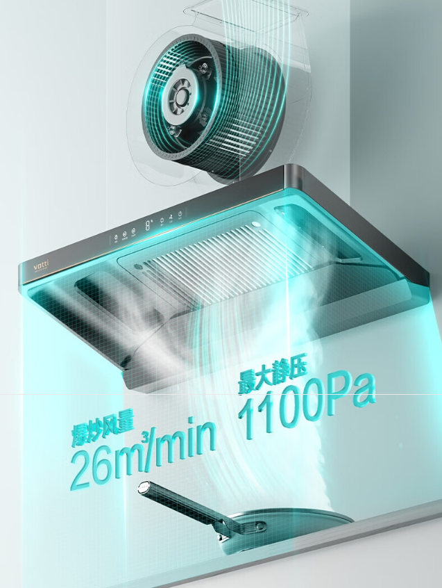 三腔分区拢烟 油烟无侧逃 ,三维超薄机身好看更实用, 21度下潜机身吸烟更快更净 ,加速导烟翼高效有序排烟 ,大风量强风压油烟瞬吸畅排