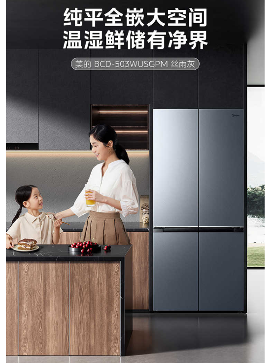 503L高容空间,全空间净化抗菌 99.99%,净味99.2%,抗病毒 99.99%,60cm纯平全嵌,定制鲜储空间,金属内饰,风冷无霜,丝雨灰面板