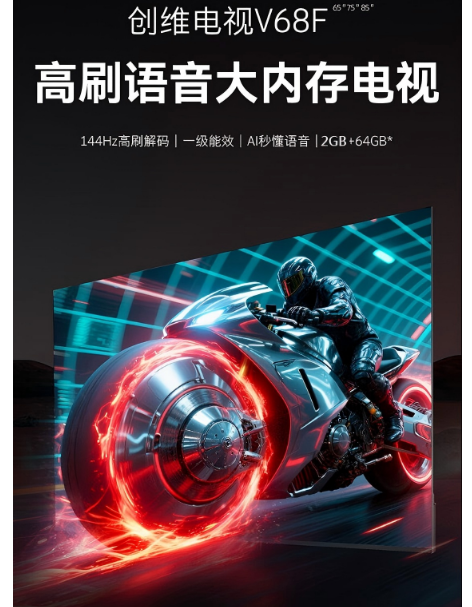 144Hz高刷解码, AI秒懂语音, G画质引擎,2GB+64GB,新国标一级能效, AE~1.02 4K HDR10, 三重健康护眼